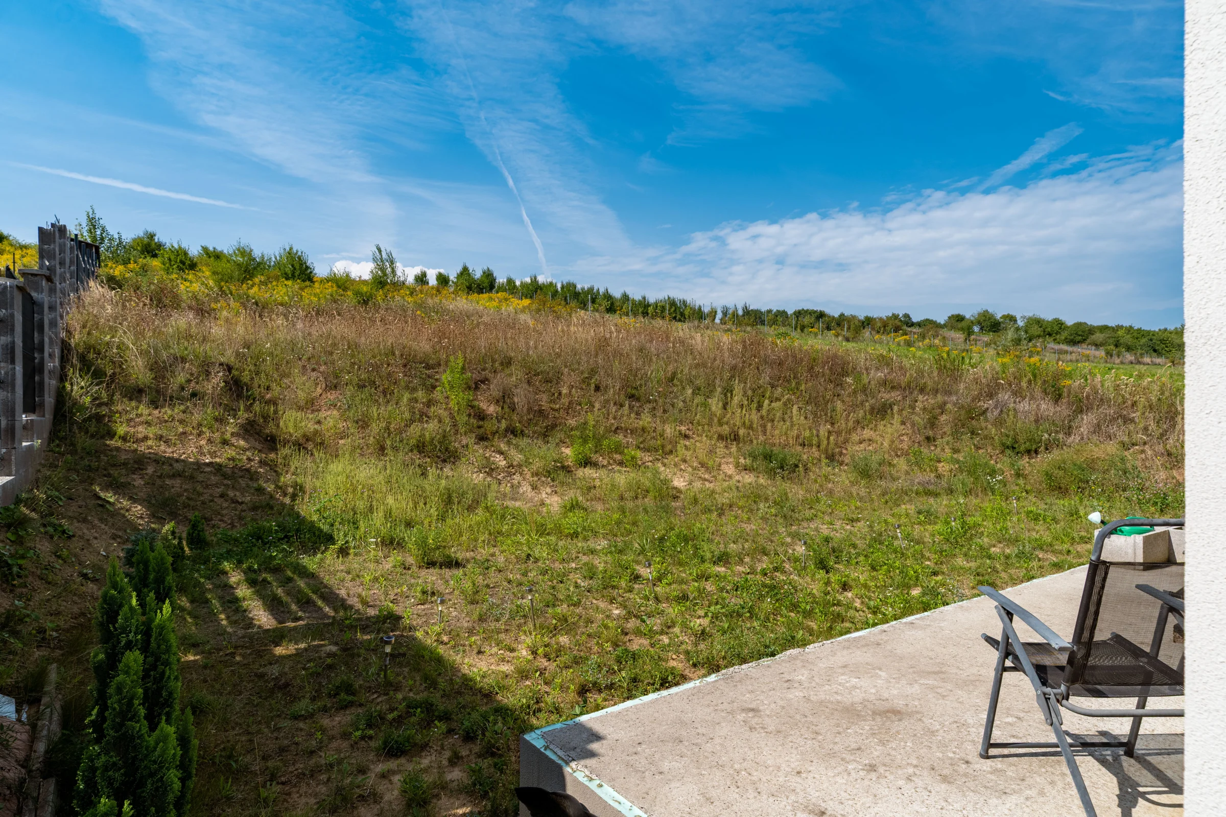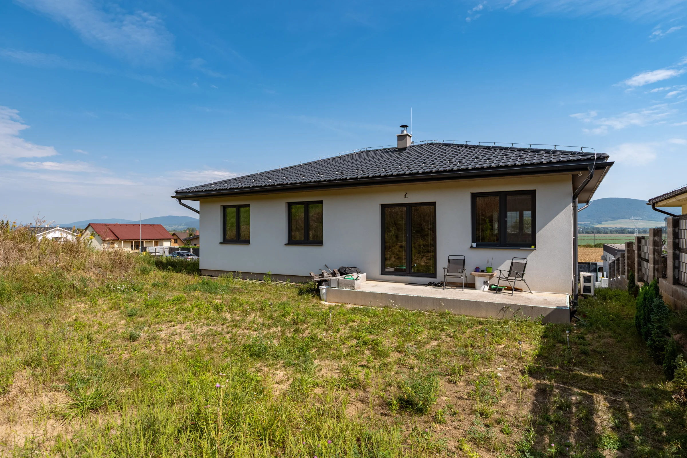 Z obývačky je výstup na vonkajšiu terasu, z ktorej máme výhľad na celú zadnú časť pozemku.