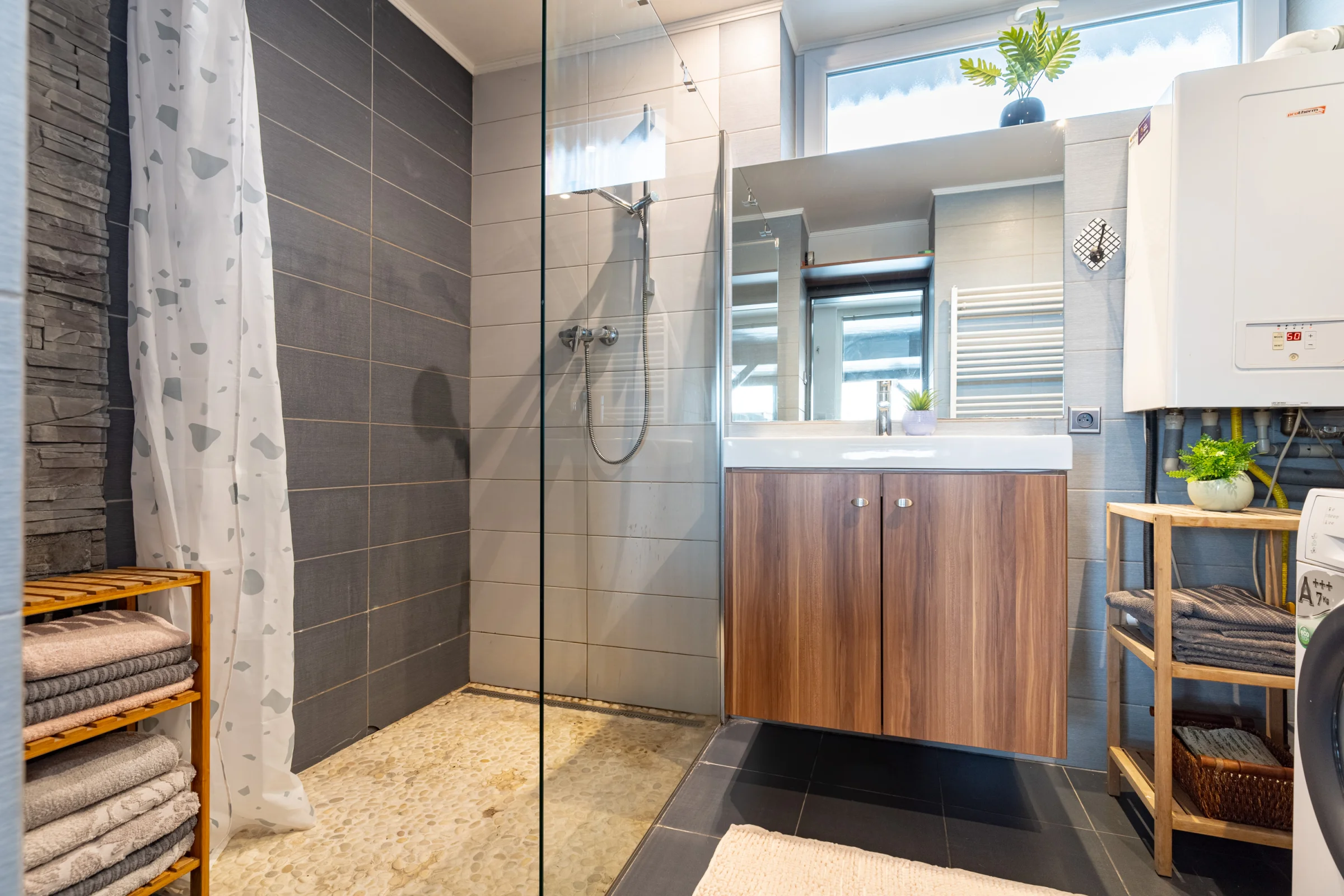 Vykurovanie a ohrev vody sú zabezpečené pomocou plynového kotla. V kúpeľni poskytuje optimálny komfort podlahové kúrenie, zatiaľ čo v ostatných častiach domu sú použité radiátory. V obývacej časti domu sa nachádza krb, ktorý nielenže vytvára útulnú atmosféru, ale tiež zabezpečuje teplo aj pre vrchné podlažie.